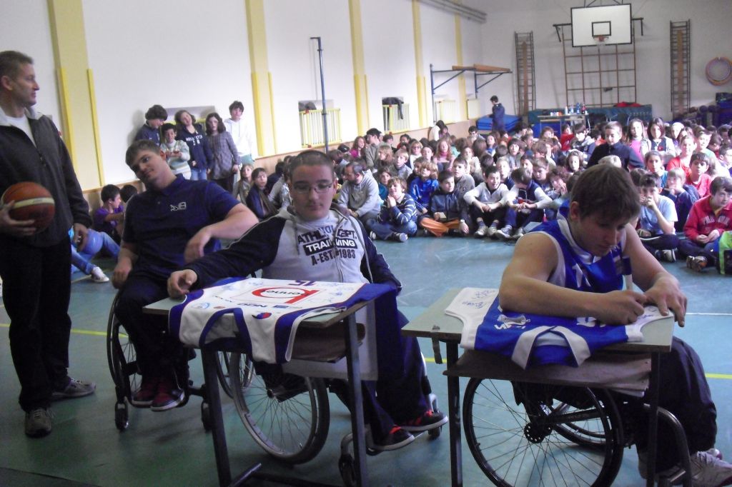 Lezione di basket con la Bennet Cantù e la Briantea84. Lunedì mattina i ragazzi della scuola media Kolbe di Lecco hanno trascorso delle ore di scuola diverse, in compagnia di due grandi cestisti militanti nella Pallacanestro Cantù, come Denis Marconato e Marco Diviach, e dei campioni di basket in carrozzina della Unipol Briantea84, come Tom Smurr, Joey Gugliotta, Joakin Lindblom, Francesco Santorelli, Angelo Scopelliti, il giovane Amos Benedetti, l’allenatore Malik Abes e il vice allenatore Chiara Ruggeri. Nella palestra dell’istituto nel rione di Rancio circa 180 studenti hanno potuto parlare di sport, come ci si può divertire e cosa significa essere un vero sportivo. Inoltre cinque fortunati hanno potuto sfidare i due lunghi della Bennet e in molti hanno provato a palleggiare e tirare a canestro su una carrozzina prestata dagli atleti della Briantea84.