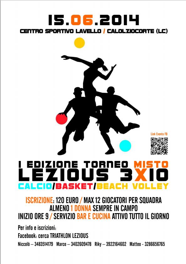 CALOLZIOCORTE – Dieci squadre, tre sport e un solo vincitore. Con questo slogan, il Lezious Team F.C. organizza il primo Triathlon misto Calcetto – Basket – Beach Volley. L’appuntamento è per domenica 15 giugno al Centro sportivo del Lavello a Calolziocorte (LC).