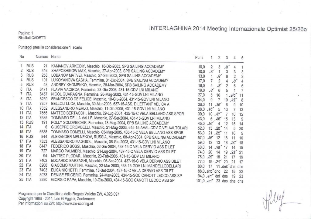 Cadetti: 1. Arkodiy Kamanov (Yc San Pietroburgo Rus – 2/3/4/1); 2. Max Shaposhikow (Yc San Pietroburgo Rus – 1/3/3/3); 3. Matvei Lobanov (Yc San Pietroburgo Rus – 1/8/2/2); 4. Sasha Lukoyanova (Yc San Pietroburgo Rus- 1^ femmina – 7/2/4/4); 5. Andrey Khomenko (Yc San Pietroburgo Rus – 4/2/6/6).