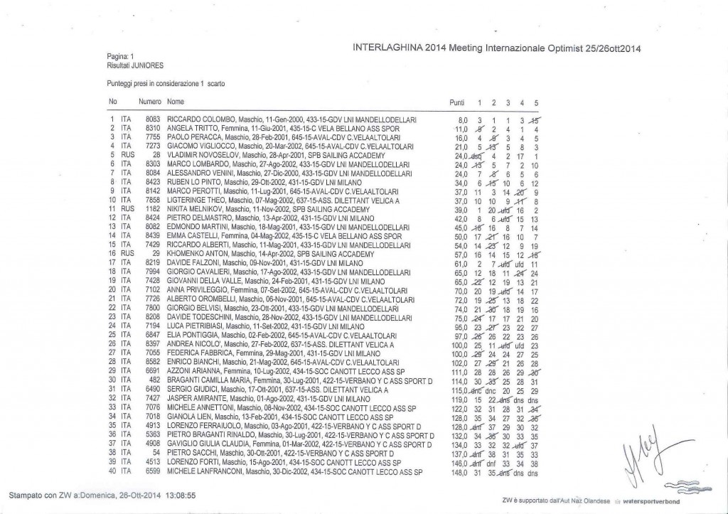 Juniores: 1. Riccardo Colombo (Lni Mandello Lario – 3/1/1/3 i piazzamenti con scarto); 2. Angela Tritto (Circolo vela Bellano – 1^ femmina – 2/4/1/4); 3. Paolo Peracca (CV Alto Lario Gravedona – 4/3/4/5); 4.Giacomo Vigliocco (CV Alto Lario Gravedona – 5/5/8/3); 5.Vladimir Novoselov (Yc San Pietroburgo Rus – 4/2/17/1).