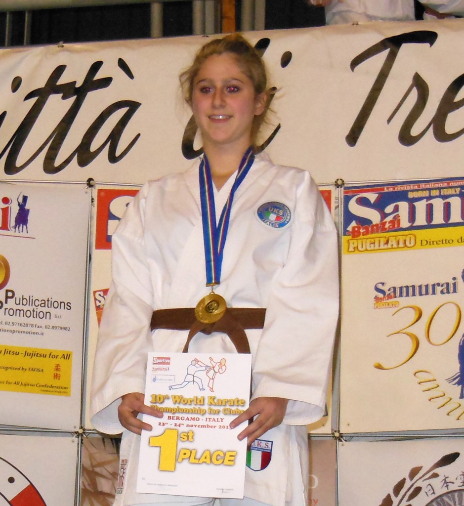 Il 23 novembre 2013 inizia la sua esperienza internazionale. A Treviglio, nella 10a edizione del “Campionato del Mondo per Club”, conquista l’Oro nella specialità kata. Tre settimane dopo all’ “European Karate Championship” di Cluj-Napoca (Romania) coglie una strepitosa medaglia di Bronzo nel kumite ed un ottimo 4° posto nel kata. Nel mese di giugno 2014, gli impegni scolastici la tengono forzatamente lontana dal Campionato Europeo WUKF. Spera di rifarsi al Campionato del Mondo WUKF in programma nel mese di ottobre 2014 a Szczecin (Polonia).