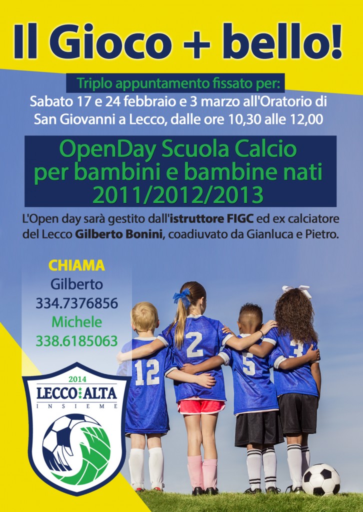 LECCO – “Il gioco più bello”. La società sportiva Lecco Alta organizza l’open day della Scuola Calcio per bambini e bambine nati negli anni 2011-2012-2013. Tre gli appuntamenti fissati, tutti all’oratorio di San Giovanni a Lecco, dalle ore 10.30 alle 12: sabato 17 e 24 febbraio e 3 marzo.