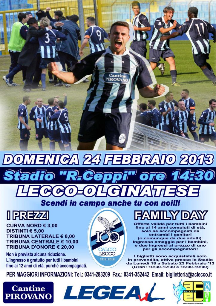 La Calcio Lecco 1912 comunica che, in occasione della gara LECCO-OLGINATESE, in programma Domenica 24 Febbraio ‘13 con inizio alle ore 14:30 presso lo Stadio “Rigamonti-Ceppi” di Lecco, al fine di agevolare i propri sostenitori e limitare il più possibile i disagi dinnanzi ai botteghini e nelle procedure di accesso alle tribune, è stato predisposto un servizio di prevendita attivo presso la Segreteria di Via Don Pozzi a Lecco in base al seguente calendario: