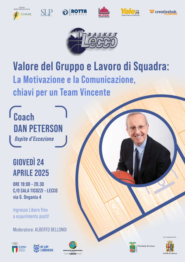 Giovedì 24 aprile arriverà a Lecco coach Dan Peterson, icona della pallacanestro italiana, ma non solo. L’occasione sarà il convegno sportivo dal titolo il “Valore del gruppo e lavoro di squadra: la motivazione e la comunicazione, chiavi per un team vincente”.