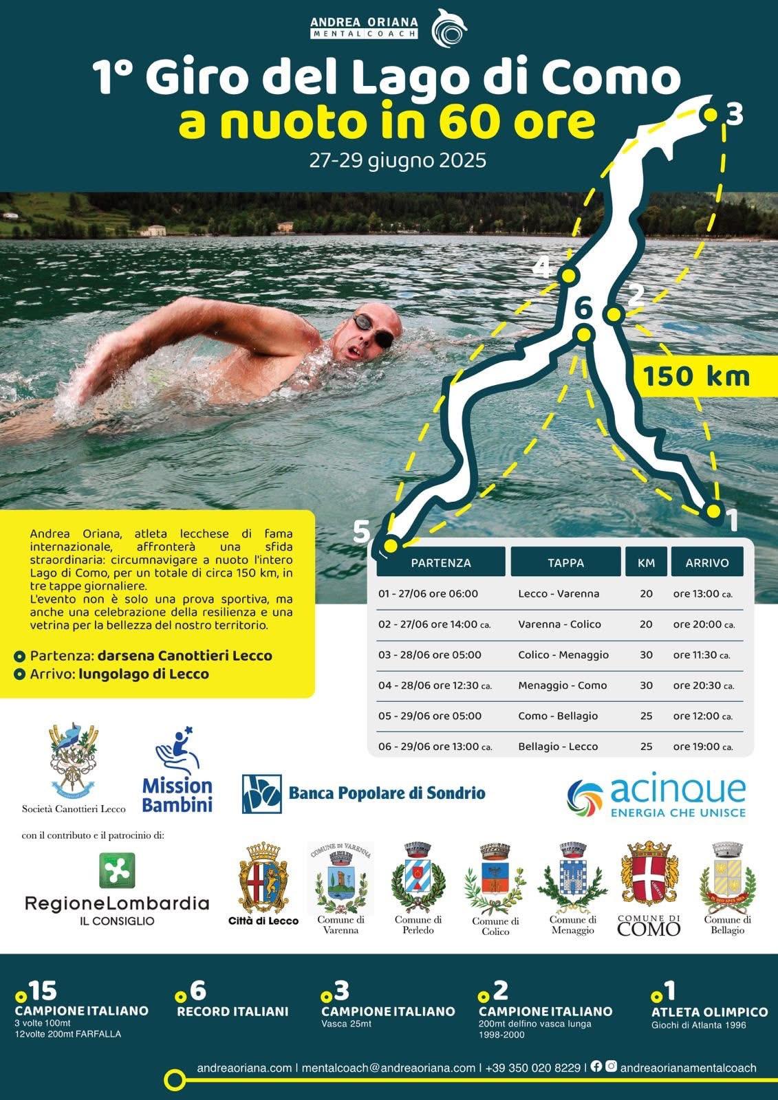LECCO – Una sfida con il suo lago, ma soprattutto una sfida con se stesso: Andrea Oriana, campione di nuoto lecchese, punta a firmare l’impresa: completare, per la prima volta, il Giro del Lago di Como a nuoto. La data fissata è quella dell’ultimo weekend del mese, 27-29 giugno, per percorrere, a suon di bracciate, l’intero perimetro del lago: 150 chilometri in 60 ore