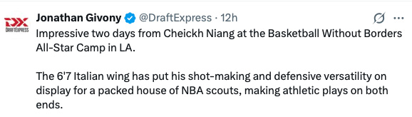Niang è stato convocato al Basketball without Borders e sembra abbia destato una grandissima impressione negli scout NBA e NCAA, sia a livello fisico che si potenziale. A confermare il tutto ci ha pensato Jonathan Givony di ESPN, uno dei massimi esperti americani nella valutazione del potenziale dei futuri giocatori, come dimostrato nel tweet condiviso.