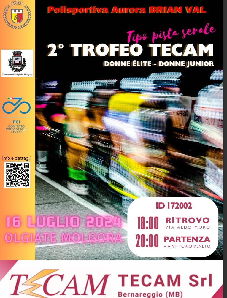 OLGIATE MOLGORA – Due giorni dopo la fine del Giro d’Italia Women e dei Campionati Europei su pista di Cottbus, a Olgiate Molgora martedì 16 luglio, si svolgerà la seconda edizione del Trofeo Tecam. Promossa dalla Polisportiva Aurora Brian Val, la gara serale “Tipo Pista” richiamerà sulle strade della cittadina lecchese atlete della categoria élite (la massima categoria del ciclismo femminile, ndr), U23 e Juniores.