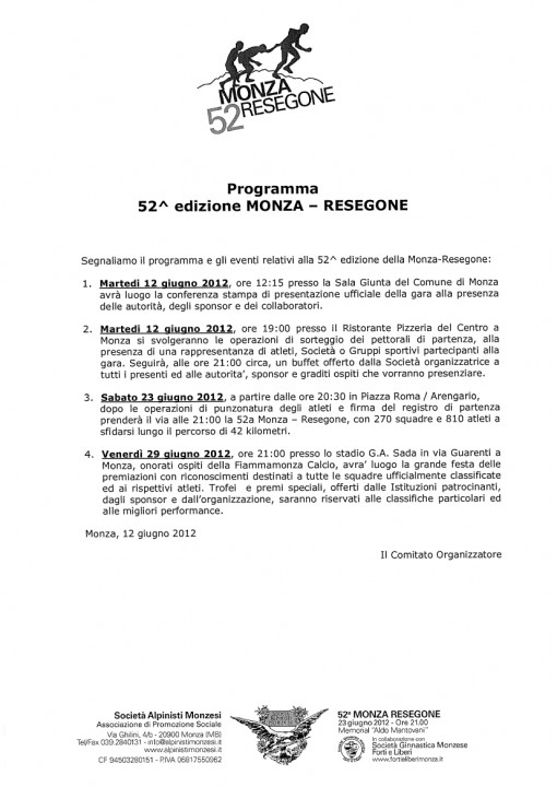 “Siamo rimasti piacevolmente sorpresi dal numero di iscritti – ha dichiarato Enrico Dell’Orto, presidente della Società Alpinisti Monzaesi – ci fa piacere constatare due trend in crescita: il costante aumento della partecipazione femminile e di neofiti, che si sono lasciati trascinare dal fascino della manifestazione verso questa vera e propria impresa. la Monza – Resegone promette grandi emozioni e mantiene sempre le aspettative, offrendo spettacolo, sentimento e un ambiente mozzafiato in una cornice indimenticabile. E’ importante che tutti i partecipanti, soprattutto i neofiti, tengano bene in mente che la gare è impegnativa e richiede una preparazione adeguata, non solo per la lunga distanza, ma anche per la difficoltà di alcuni passaggi. Si tratta di una competizione a squadre: l’individualismo deve venire meno, a beneficio di un coordinamento e di un’intesa vincente con il ritmo dei propri compagni. Infine, un consiglio: per chi non ha mai visto la Monza – Resegone sarebbe opportuno effettuare un sopralluogo dell’ultimo tratto, immerso nei boschi””.