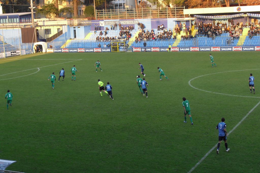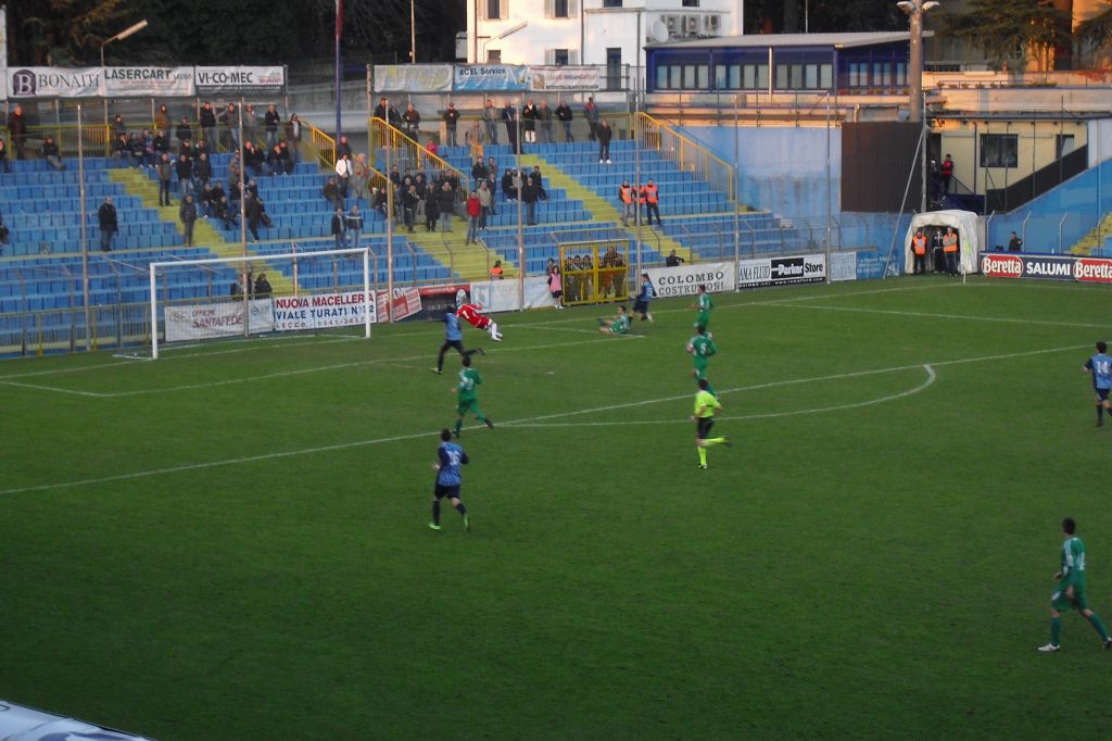 sulla sua girata miracolo di Aprea che salva il risultato. Un minuto più tardi conclusione debole di Briglia, che ci prova anche al 12’, quando il suo tiro finisce in curva Nord. Il Lecco è assente nei primi minuti: Gatti al 15’ perde un brutto pallone, per poco De Cenco non ne approfitta. Alla pochezza di gioco la difesa di Pellegrino aggiunge l’ingenuità che regala al Bellaria il vantaggio: al 18’ Ischia in chiusura calcia la palla addosso a Castelnuovo, la sfera finisce sui piedi di Turchetta che scarta in tranquillità Aprea e deposita la palla nel sette. Sul tiro del numero 10 decisiva la deviazione di Caforio che nel tentativo di rinviare il pallone lo ha spedito in fondo alla rete. Al 25’ il monologo romagnolo continua: destro di Turchetta dal limite bloccato da Aprea. Il pubblico comincia a rumoreggiare per il non-gioco degli uomini di Pellegrino, che rischiano lo 0-2 alla mezz’ora: Turchetta serve Rolandone a centro area, l’esterno conclude sul fondo da buonissima posizione. Al 32’ ammonizione per Gatti. Sulla punizione seguente Briglia da solo nell’area piccola non riesce a siglare il doppio vantaggio. Al 35’ si sveglia il Lecco: Fall serve Fabbro a centroarea, il friulano calcia a lato. Proprio Fabbro e Maiese escono al 37’, lasciando spazio a Rebecchi e Viviani. Al 44’ miracolo di Aprea che salva il risultato, deviando in corner la conclusione da distanza ravvicinata di De Cenco.