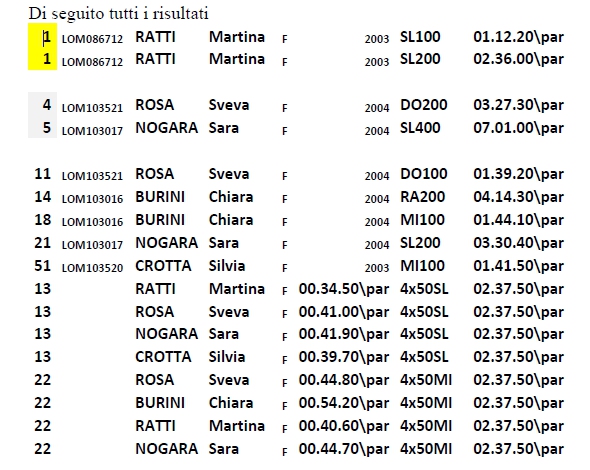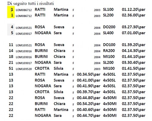 Protagonista della rassegna Martina Ratti che domina le gare a stile libero vincendo sia i 100 che i 200. Di rilievo soprattutto il tempo nuotato nei 200 che rappresenta il nuovo record sociale dalla Canottieri Lecco.