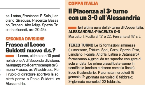 E’ notizia di oggi, riportata a pagina 25 della Gazzetta dello Sport, che la Calcio Lecco sarebbe intenzionata a cambiare nuovamente il Direttore Sportivo salutando l’attuale Francesco Lamazza puntando su Paolo Guidetti (ex Alessandria).