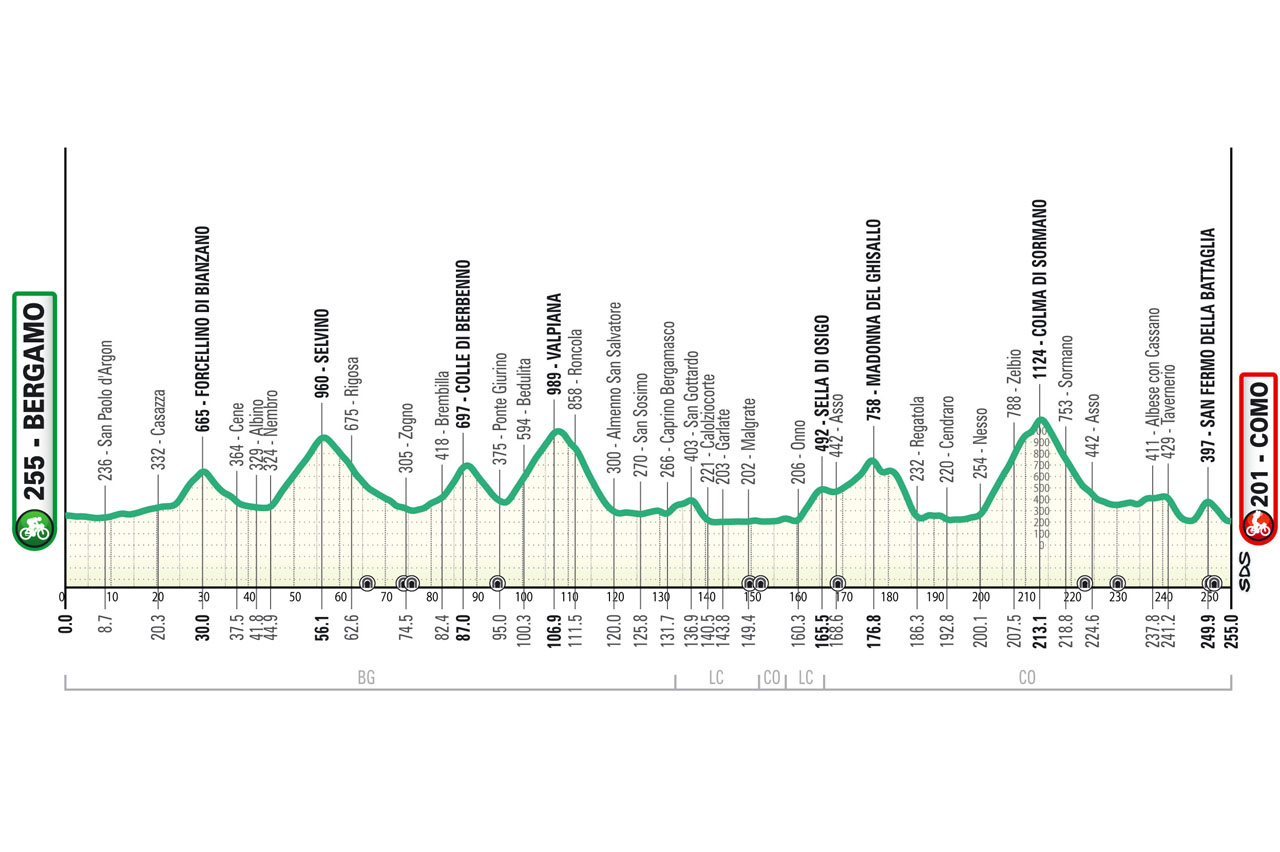 Come anticipato, partenza da Bergamo in direzione val Seriana per un breve tratto pianeggiante prima di affrontare una serie di salite nelle Prealpi attorno alla città. Si concatenano senza respiro il Forcellino di Bianzano (Valle Rossa), la salita di Selvino, il Colle di Berbenno e Valpiana che conclude questa prima serie di salite che coprono oltre il 50% del dislivello complessivo della corsa.