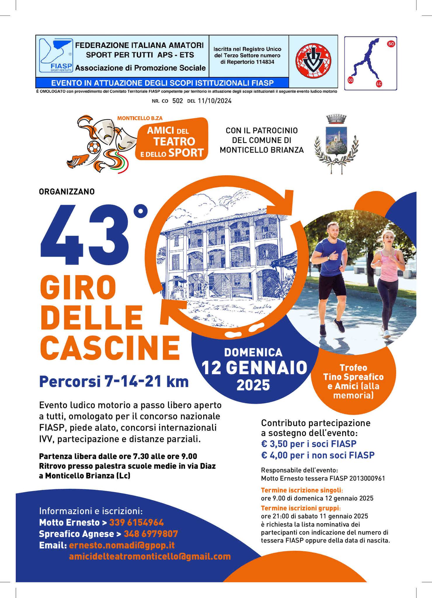 MONTICELLO BRIANZA – Monticello Brianza si prepara ad accogliere la 43^ edizione del “Giro delle Cascine”, un evento ludico-motorio che unisce sport, socialità e tradizione. L’iniziativa, organizzata dagli “Amici del Teatro e dello Sport” con il patrocinio del Comune di Monticello Brianza e l’omologazione della Federazione Italiana Amatori Sport per Tutti (FIASP), offre percorsi a passo libero di 7, 14 e 21 chilometri.