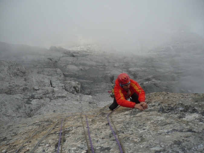 “Adesso me lo scrivo proprio sul muro di casa, non andare mai più a scalare su una Nord con lo zero termico sotto i 4500 – racconta Fabio dalle pagine del sito www.ragnidilecco.com poi prosegue – Su Baston La Baffe bisogna scalare, non basta salire. Tratti lunghi e obbligati, niente sconti, roccia in tantissime lunghezze veramente agghiacciante (stracomplimenti agli apritori, azzardare certi run-out su certa roccia e su difficoltà sul 6c…giù il cappello!!) e tre muri fantastici in mezzo. Il freddo che ho patito nel terz’ultimo tiro, scalando con cinque strati tra cui piumino e guscio proshell (!), non lo dimenticherò mai più!… E poi, il famoso sole che doveva arrivare alle 15 uscito soltanto il secondo giorno per dieci minuti mentre facevamo la foto di vetta, è stata la beffa totale. Vedermi l’ombra e lo sfondo di roccia illuminata mentre guardo Matteo…ma quando mai. Mi sono detto, giuro che questa Estate non mi lamenterò del caldo neppure se dovessi capitare in coda chilometrica con l’aria condizionata rotta…”