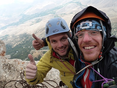 Finalmente la parete spiana e poi finisce. Seguiamo la cresta che riporta al canale di discesa di poche ore prima, disarrampichiamo su terreno più facile ma esposto, soliti chiodi, solita doppia e solito brivido.
