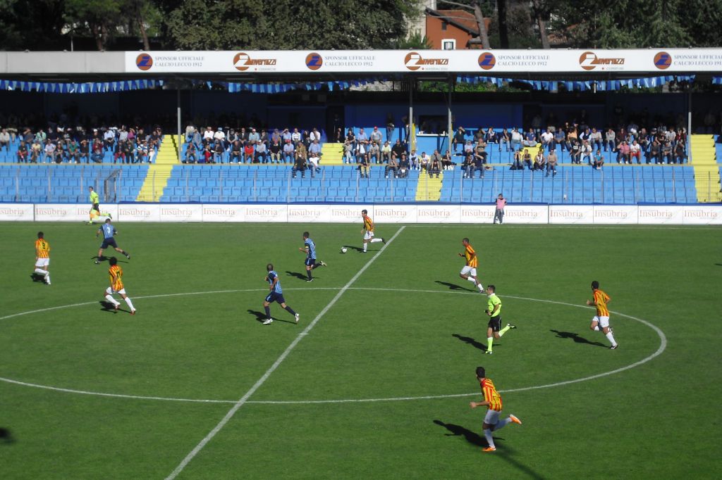In un clima di protesta degli ultras del gruppo Psycho presente in Curva Nord, che in un volantino hanno annunciato lo sciopero del tifo per due partite casalinghe e espresso piena fiducia in Maurizio Pellegrino, il neotecnico bluceleste opta per un assetto ultra offensivo con il trio d’attacco composto da Fall, Fabbro e Temelin. Al 1’ Lecco subito aggressivo c on Garzon che recupera palla e serve Fabbro che non riesce ad agganciare da ottima posizione. Ospiti pericolosi al 4’ con Romanelli, ma la sua conclusione passa a fil di palo. La risposta del Lecco un minuto più tardi con Fall che non ribadisce in rete un tiro debole di Rebecchi. Col passare dei minuti la Poggibonsi prende il dominio territoriale: la squadra toscana va vicina al vantaggio all’8’ con un colpo di testa di Cirina che termina sul fondo. I toscani si fanno vedere anche al 14’ con un cross dalla destra di Cutrupi che per poco non