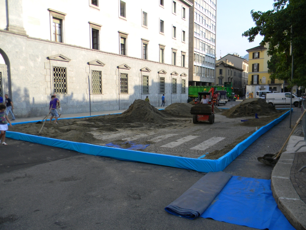 Sono iniziati di buon ora i lavori in piazza Garibaldi per la creazione del campo di Beach Volley dove si disputerà la grande tre giorni sotto rete. Tanta, tantissima sabbia e una mini escavatore per spargerla su tutto il terreno di gioco uniformandola minuziosamente.