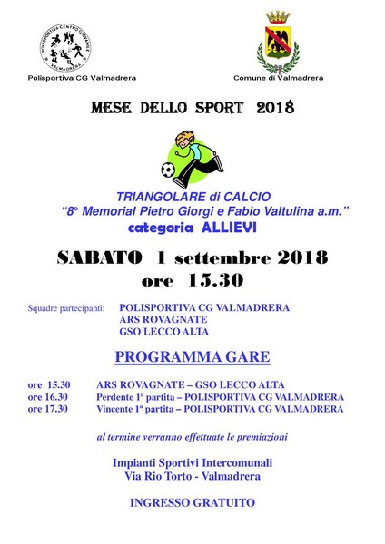 VALMADRERA – Al via l’8^ edizione del torneo Pietro Giorgi e Fabio Valtulina che si inserisce nel Mese dello Sport a Valmadrera. Nel pomeriggio di sabato 1 settembre la Polisportiva Valmadrera per la categoria Allievi di calcio organizza la manifestazione dedicata al nonno ed al papà di Pietro Valtulina, storico giocatore.