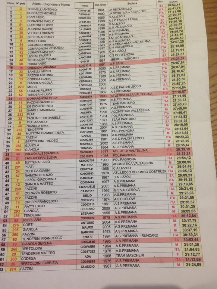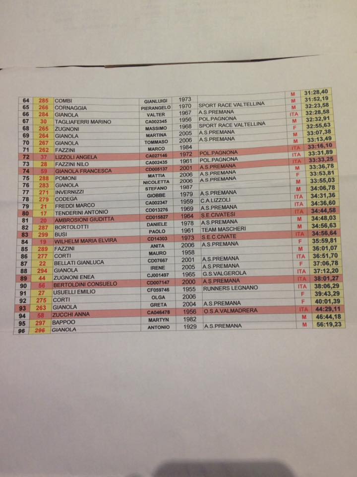 La femminile la vittoria è andata a Ariana Oregioni (G.P. Santi) che si è aggiudicata il podio più alto con il tempo di 25’24”57 secondi, facendo registrare anche lei il nuovo record al femminile. Al secondo posto Elisa Compagnoni (Atletica Alta Valtellina) che ha stoppato le lancette del cronometro sul tempo di 27’16”87; al terzo posto Alessandra Valgoi (Atletica Alta Valtellina) con il tempo di 28’39”19.