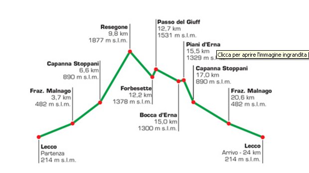 Ai nastri di partenza 401 iscritti, che dovranno macinare 24 chilometri con un dislivello positivo di 1800 metri. Si parte e si arriva in piazza Cermenati (214 metri) dopo aver raggiunto la cima del Resegone (1877 metri) passando per il rifugio Stoppani, quindi Erna, vetta e discesa dal “versante morteronese” per ritornare in Erna facendo il passo del Giuf, di nuovo Stoppani e arrivo a Lecco.