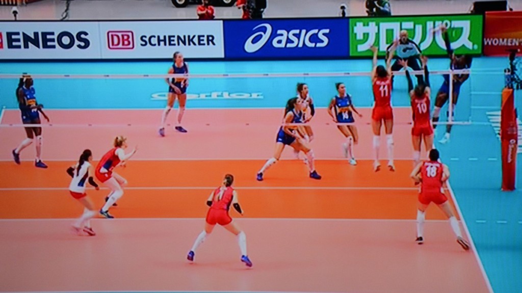 Le azzurre partono benissimo distaccando le avversarie fin dalle prime battute, ma a metà del primo set conoscono la resistenza serba e in particolare la forza di Tijana Bošković e di Brankica Mihajlović, atlete di punta della Serbia.