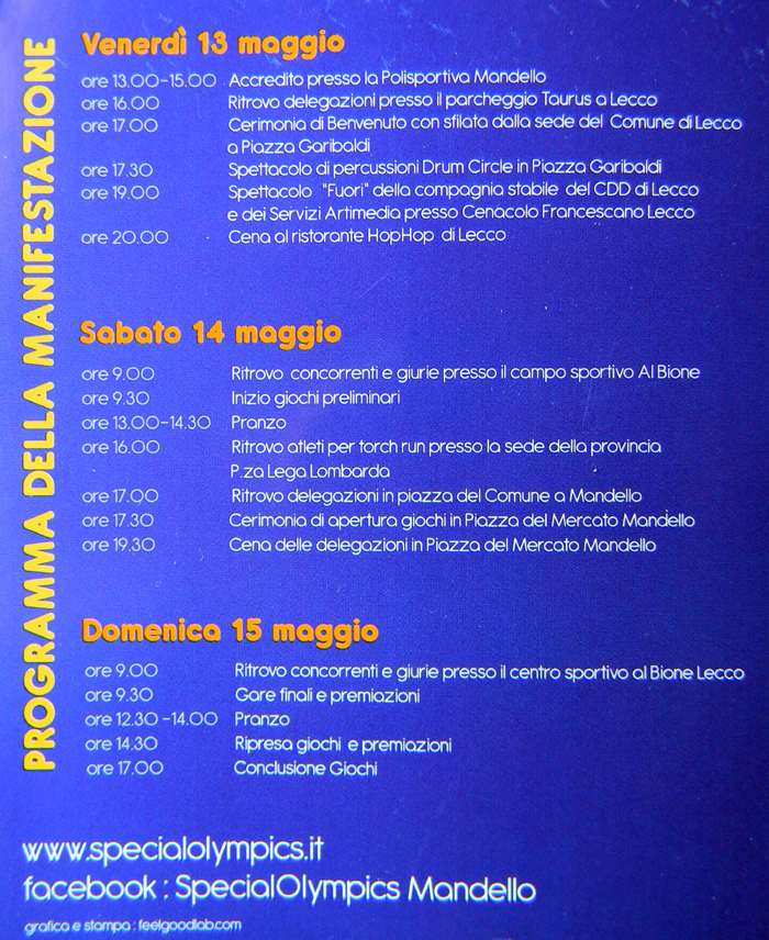 È iniziata ufficialmente l’undicesima edizione degli Special Olympics Italia della Lombardia. L’evento, che si svolgerà nel week end nei comuni di Mandello, Lecco e Abbadia Lariana è dedicato agli atleti con disabilità intellettive. Organizzatore della manifestazione è la Polisportiva di Mandello del Lario, il cui vicepresidente Carlo Gilardi ha dichiarato: “L’iniziativa è importantissima per il territorio. Organizzando l’evento abbiamo avuto modo di notare la collaborazione tra le varie istituzioni, che non pensavo fosse così estesa; inoltre noi, come società sportiva siamo stati fieri dell’organizzazione perché dal 2004 abbiamo un sezione chiamata “Arcobaleno” dedicata ai ragazzi disabili che partecipano a gare di livello regionale, nazionale, ed un nostro ragazzo è andato anche agli Europei lo scorso anno.”