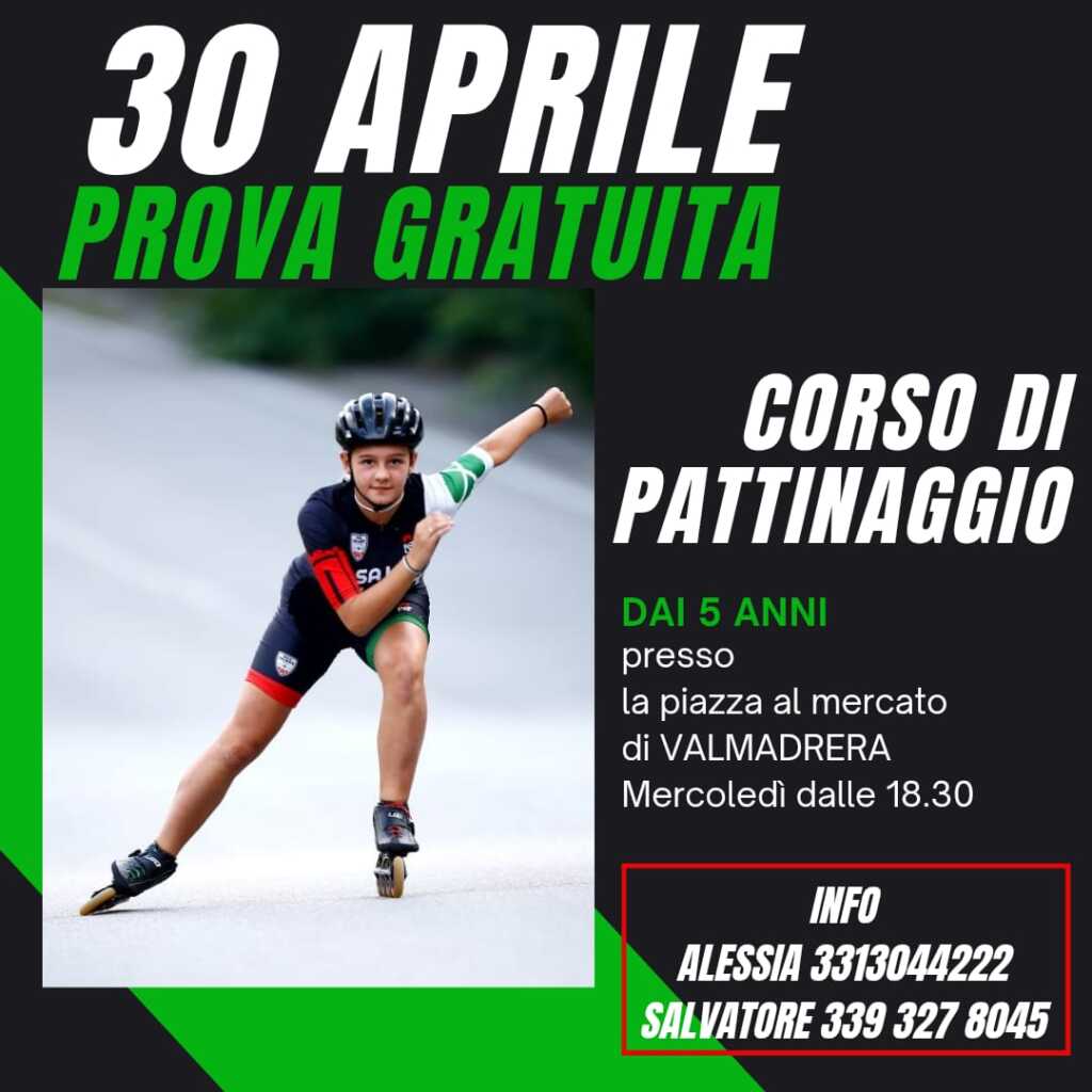 L’open day – aperto a maschi e femmine, a partire dai cinque anni – si svolgerà proprio nella piazza valmadrerese, mercoledì 30 aprile a partire dalle 18.30. Dal mercoledì successivo partirà il corso di avviamento al pattinaggio, composto da 5 lezioni di un’ora cadauna, che terminerà il 4 giugno. Il costo complessivo è di 60 euro.