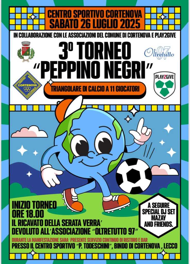 CORTENOVA –Calcio e beneficienza si incontrano oggi a Cortenova per il terzo trofeo “Peppino Negri”, triangolare calcistico a scopo benefico, il cui ricavato verrà tutto donato all’associazione sportiva “Oltretutto ‘97”.