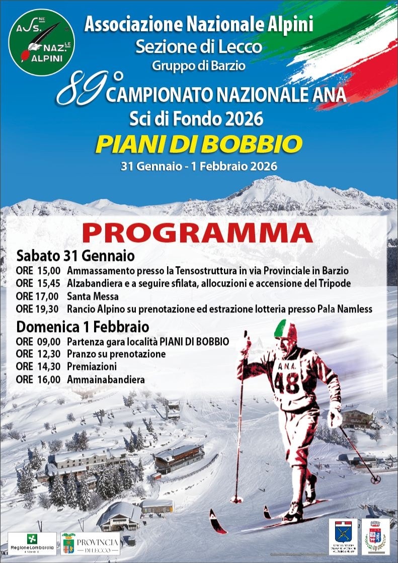 LECCO – Barzio e i Piani di Bobbio si preparano ad accogliere l’89ª edizione del Campionato nazionale ANA di sci di fondo, in programma domenica 1° febbraio. L’evento è organizzato dalla Sezione ANA di Lecco insieme al Gruppo Alpini di Barzio, che proprio quest’anno celebra il centenario della propria fondazione.