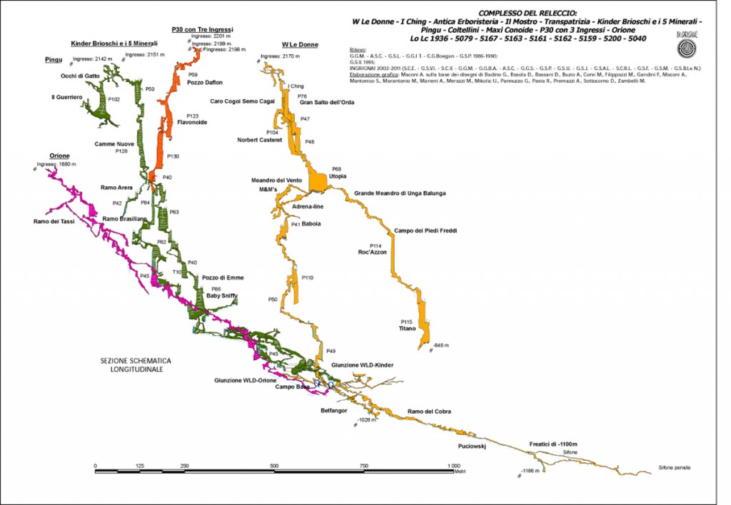 Una dovuta precisazione sulla profondità di W Le Donne dato che sui -1260m si è tanto parlato con molte polemiche sterili: in un sistema come quello della Grigna con diciotto ingressi noti la profondità non è affatto così semplice da calcolare. Nello specifico, la poligonale da noi fatta per il livello del lago finale, se consideriamo solo W Le Donne e compensando in compass gli errori della poligonale sull’intera grotta dà -1225m. A questo ho aggiunto 2m perchè se entravo in acqua i miei piedi erano 2m più in basso del livello d’acqua, quindi -1227m. Aggiungendo però le poligonali delle altre grotte che si collegano a WlD e mediando in modo automatico in compass le posizioni dei vari punti di giunzione tra le diverse grotte dando priorità a quelle rilevate meglio, si ottengono i -1260m ufficialmente rilevati (maggiori dettagli qui).