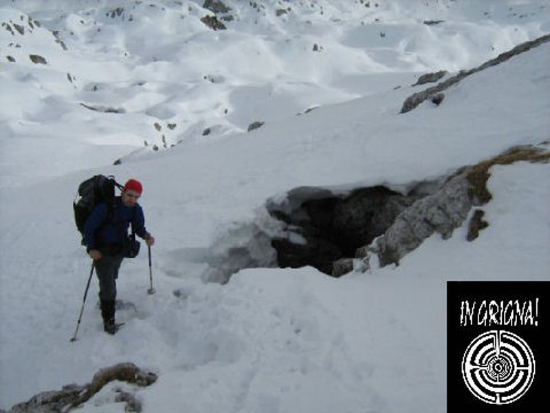 Il messaggio ci raggela: l’ansia accumulata per il ritardo della notte precedente di Maukal, un problema che mi è occorso al ventrale sul pozzo con la corda lesionata, le previsioni del tempo che davano neve e freddo in uscita per domenica e il nuovo messaggio di Romeo mi mettono ko. Risalgo distrutto non tanto per i tre pesanti sacchi, ma per la psiche annientata dai vari eventi. A -200m anche io comincio a sentirmi poco bene e riscontro problemi intestinali legati molto probabilmente all’ansia. Finalmente giungiamo all’uscita dove dalla base del secondo pozzo sentiamo voci indistinte, poi capiamo che sono Romeo, Simona Manzini e Enrico Benedetti (capanàt del Bogani) che sono venuti a darci una mano con i sacchi di materiale. Il sentire le loro voci ci rincuora e ci riempie di energia. Il meteo esterno, seppure gelido e ventoso, è bello in quanto la perturbazione è passata con un giorno di anticipo.