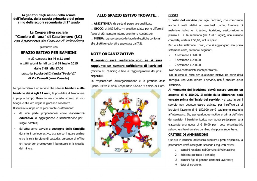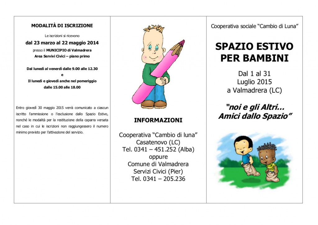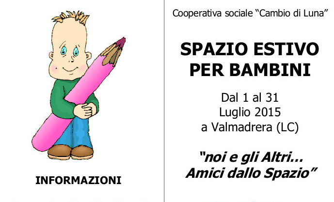 VALMADRERA – Proseguono le iscrizioni allo Spazio Estivo per bambini promosso dal Comune di Valmadrera ed organizzato dalla Cooperativa Sociale “Cambio di Luna” di Casatenovo.