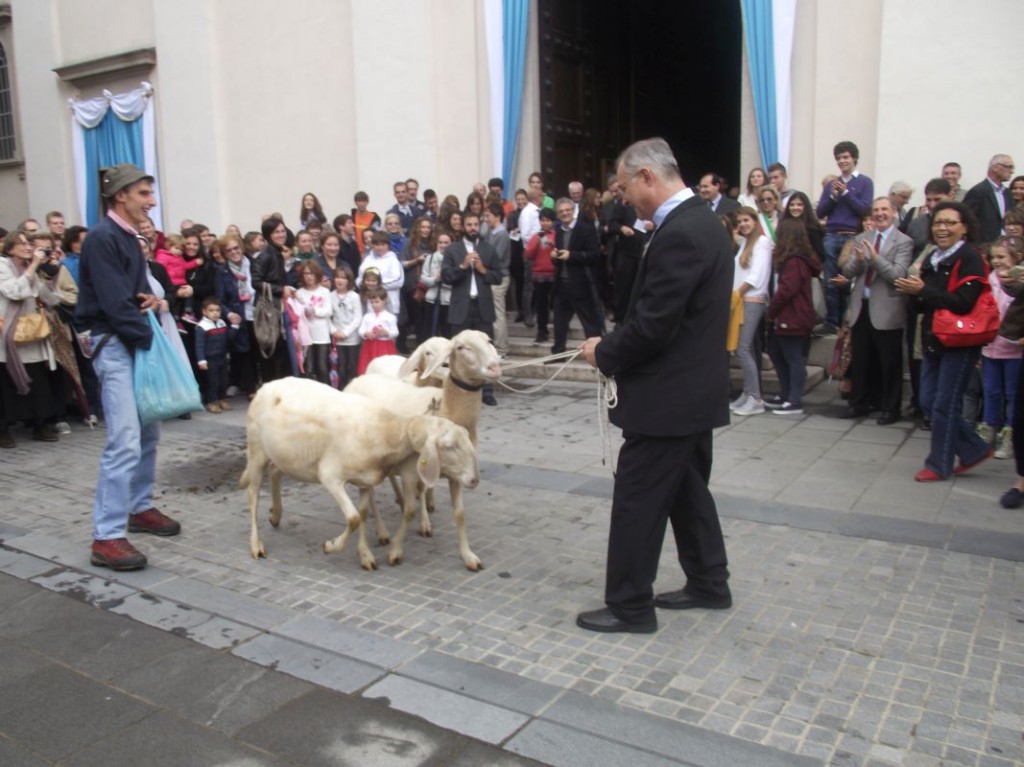 Dopo aver celebrato la messa, don Adelio è stato invitato nella piazza mons. Citterio dove un pastore gli ha passato il guinzaglio delle sue tre pecore e lo ha invitato a portale un po’ a spasso per dimostrare in modo scherzoso le sue abilità come guida per i fedeli.