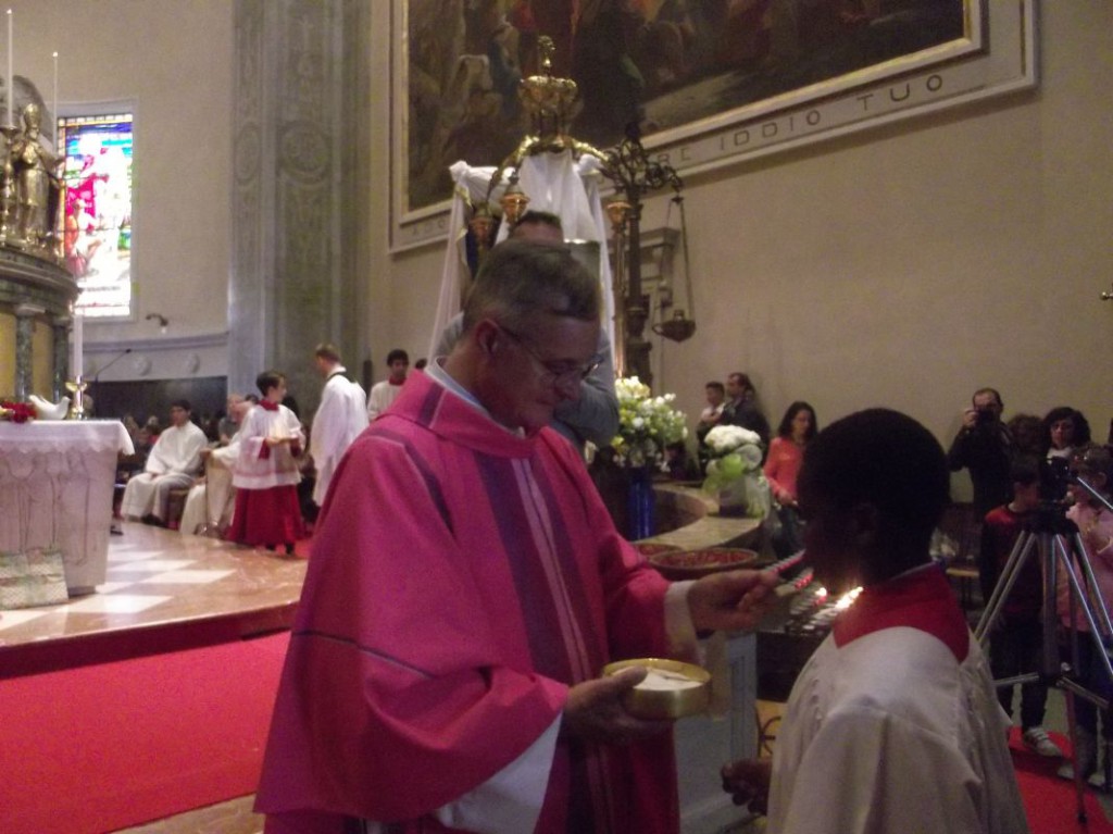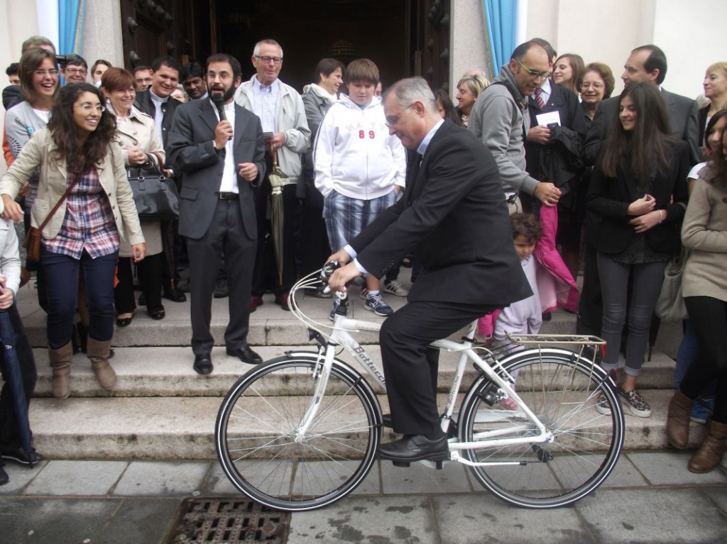 Subito dopo un ragazzo delle scuole medie, in rappresentanza di tutta la comunità, gli ha consegnato una bicicletta, dono dei parrocchiani affinché possa girare agevolmente per le vie del paese e far visita ai suoi fedeli.