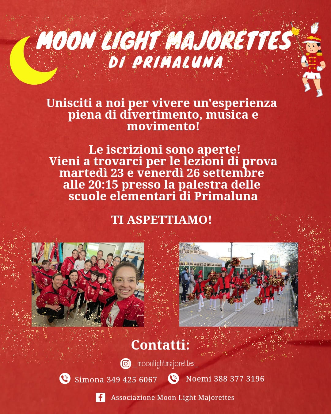 PRIMALUNA – Le Moon Light Majorettes aprono le iscrizioni a chiunque voglia approcciarsi a questa affascinante disciplina. L’invito è aperto a tutti i giovani senza particolari limiti di d’età.