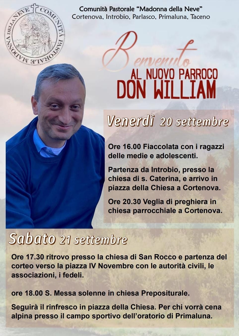 I festeggiamenti per accogliere Don William prenderanno il via venerdì 20 settembre alle ore 16 con una fiaccolata a cui parteciperanno i ragazzi adolescenti. La marcia partirà dalla chiesa di Santa Caterina a Introbio per giungere alla chiesa di Cortenova dove alle 20:30 si terrà la Veglia di preghiera.