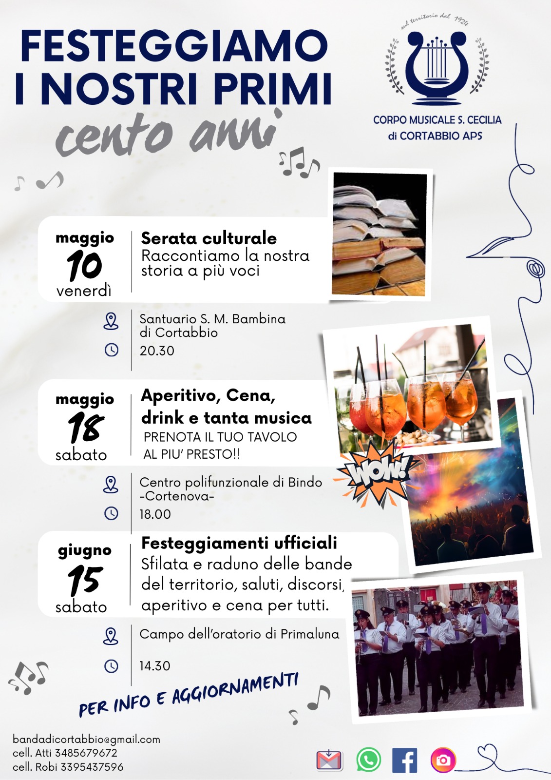 A concludere gli interventi sarà Claudia Paroli con delle considerazioni sullo stato attuale delle associazioni. A fine serata la banda offrirà un rinfresco per i presenti e distribuirà un opuscolo realizzato in occasione dei 100 anni del Corpo Musicale Santa Cecilia. Il fascicolo consiste in una raccolta di emozioni, ricordi e sentimenti da parte di chi ha vissuto, in modi e tempi differenti, l’influenza della banda nella propria vita.