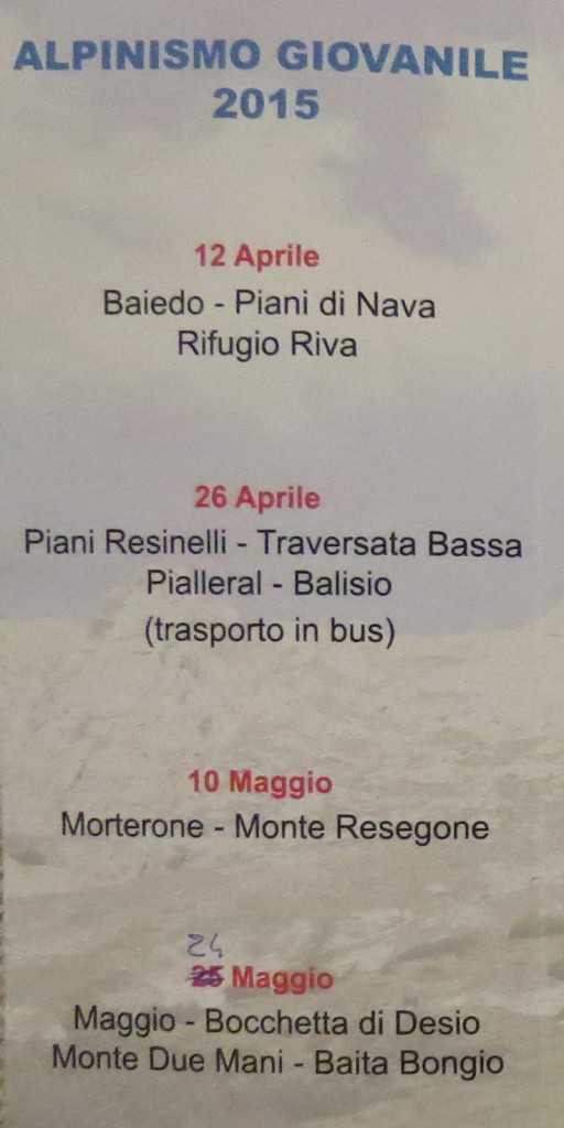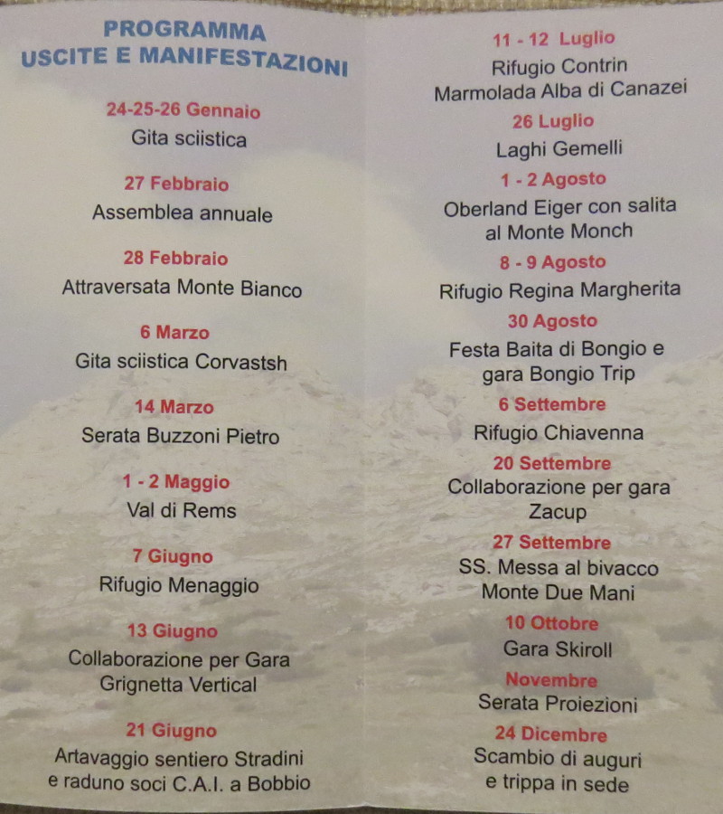 A questo punto la parola è tornata al presidente che ha presentato il calendario delle attività per il 2015, un calendario ricco con il quale sono stati confermati gli appuntamenti tradizionali, a partire dell’Alpinismo Giovanile con quattro appuntamenti (12 aprile, 26 aprile, 10 maggio e 24 maggio), la festa alla baita di Bongio con abbinata la gara di corsa in montagna Bongio Trip è fissata per il 30 agosto; la messa celebrata al bivacco del Monte Due Mani è in programma per il 27 settembre, mentre la gara di skiroll Ballabio – Piani Resinelli è fissata per il 10 ottobre. Tra le gite in programma da segnare in rosso sull’agenda quella dell’1 e 2 agosto all’Oberland Eiger con salita al Monte Monch e quella dell’ 8 e 9 agosto con salita al rifugio Regina Marghierita al Monte Rosa.