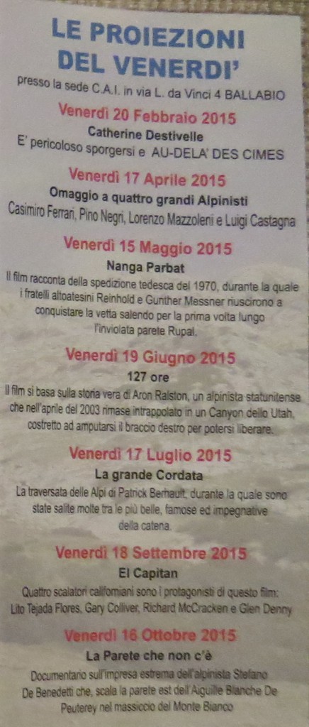 Da ricordare inoltre le proiezioni del venerdì, la prossima è in programma il 17 aprile con l’omaggio a quattro grandi alpinisti: Casimiro Ferrari, Pino Negri, Lorenzo Mazzoleni e Luigi Castagna.